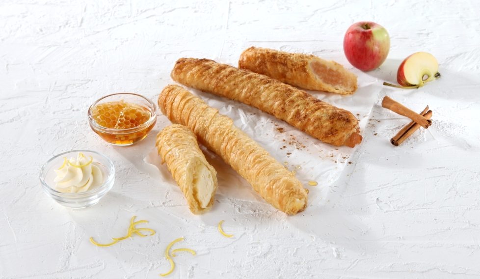Chrumkavý sladký borek z filo cesta s bohatou jablkovo-škoricovou náplňou a kúskami ovocia (65 % jabĺk).